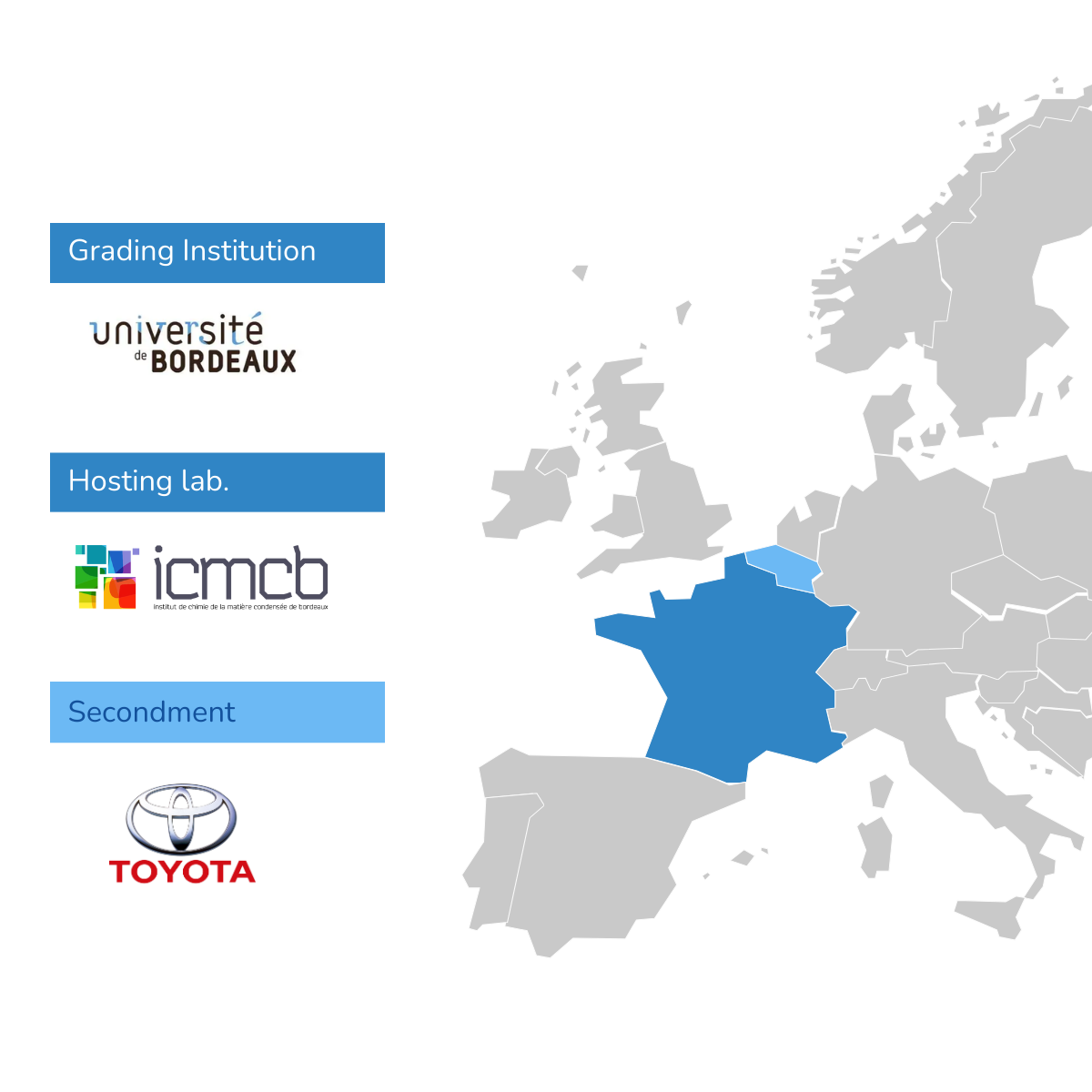 In addition to attending national and international conferences and schools, the PhD student will collaborate with an industrial partner for several periods of secondment. These periods (four months total) will take place at the Toyota Motor Europe (TME) Technical Center in Zaventem, Belgium. The R&D Material Engineering (ME) division conducts cutting-edge research for the Toyota group in Europe in the fields of batteries, fuel cells, catalysts, solar cells, materials modelling, and advanced analysis. For over 15 years, the ICMCB and TME have collaborated closely to design new electrode materials for batteries. Therefore, the PhD candidate will benefit from balanced co-supervision by academic and industrial partners.