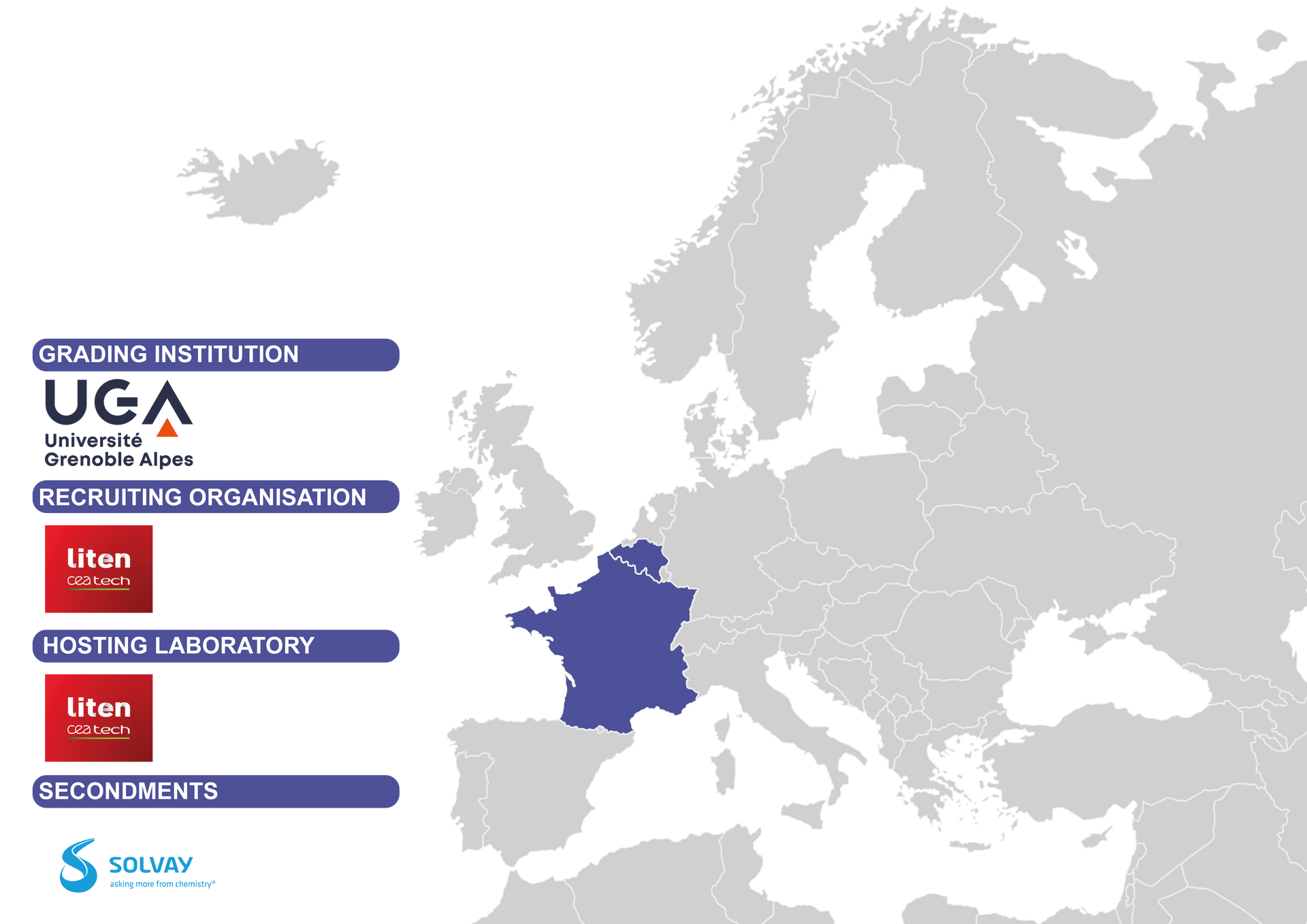 Major part of the work will be done at CEA Liten (Grenoble ) with frequent secondments at Solvay facilities in Paris and Bruxelles. Secondments in large scale instruments is envisioned as well as secondment to build theoretical framework to support the analytical work.