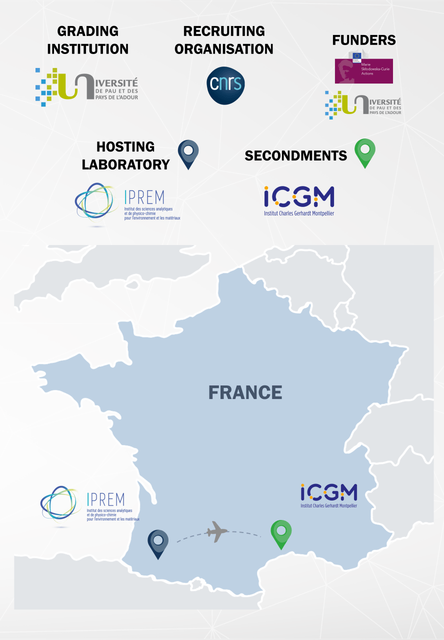 These advanced surface characterizations will be carried out at IPREM using the dedicated tools available in the lab (XPS, SEM, Auger, ToFSlM-Ei).To reach this goal, the PhD student will be based at Pau (75% time). The coating protocols and electrochemical cycling experiments will perfomed during periodic research campaigns at Montpellier (25% time).